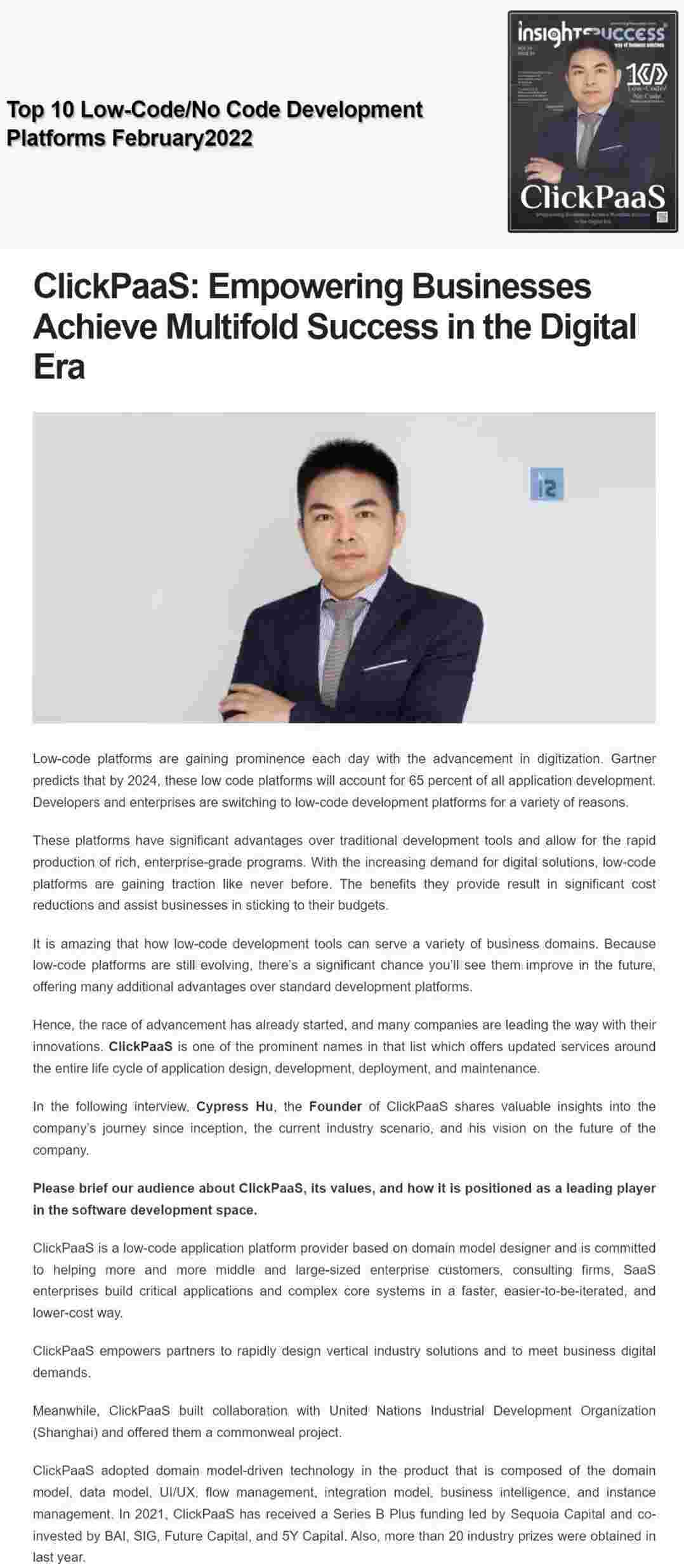 2022年年初,,钱能钱包入选外媒Insights Success低代码/无代码开发平台 Top10,,,创始人、、CEO胡柏受邀接受专访并荣登封面人物,,他与Insights Success的读者分享了钱能钱包成立的初心、、、、发展历程、、当前的行业发展趋势以及他对公司未来的展望。。。。